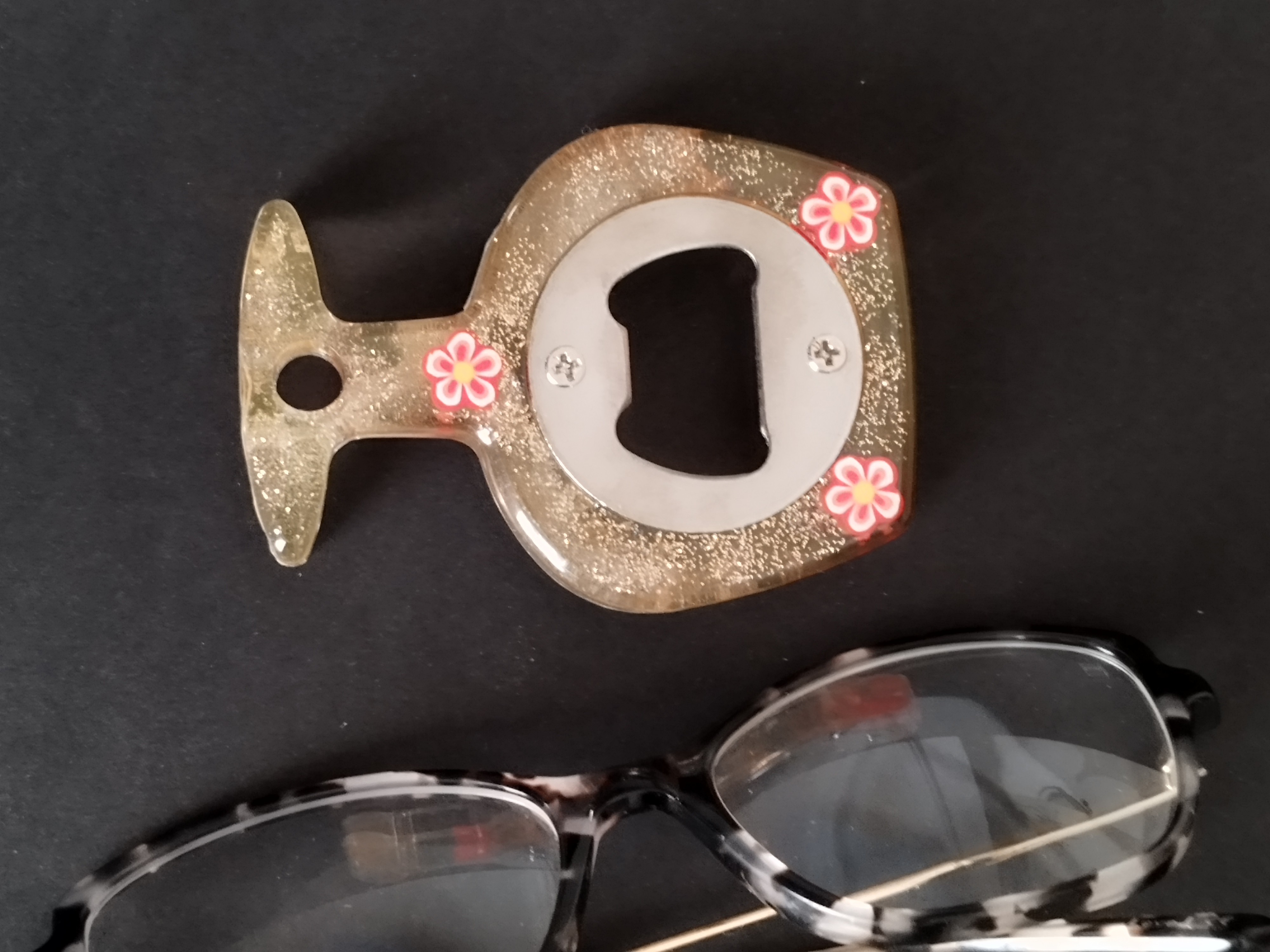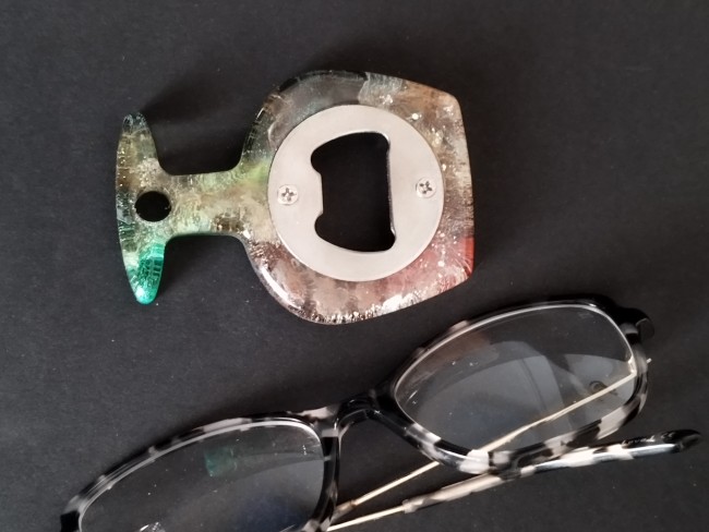 Création unique pour ce décapsuleur réalisé dans une résine colorée de manière aléatoire.