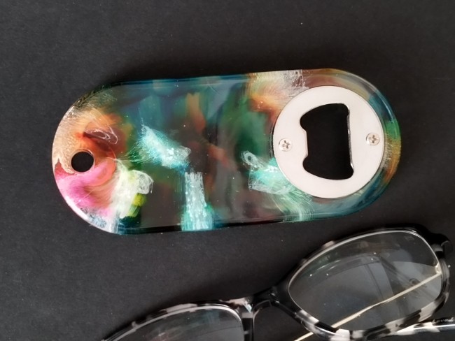 Création unique pour ce décapsuleur réalisé dans une résine colorée de manière aléatoire.