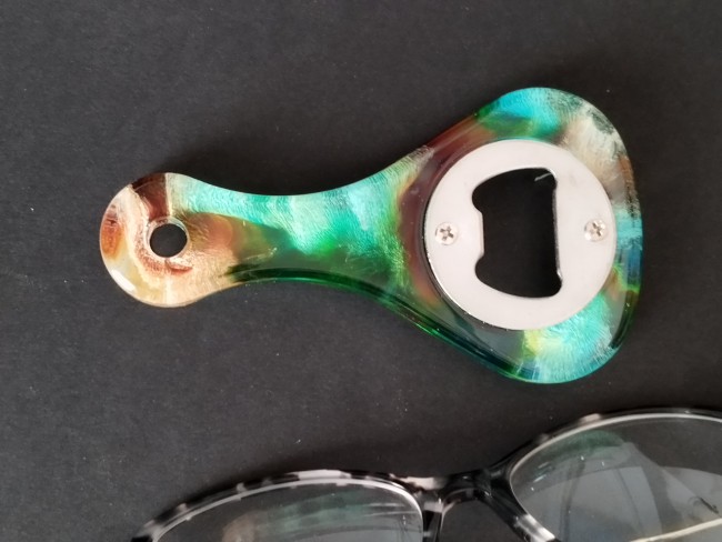 Création unique pour ce décapsuleur réalisé dans une résine colorée de manière aléatoire.